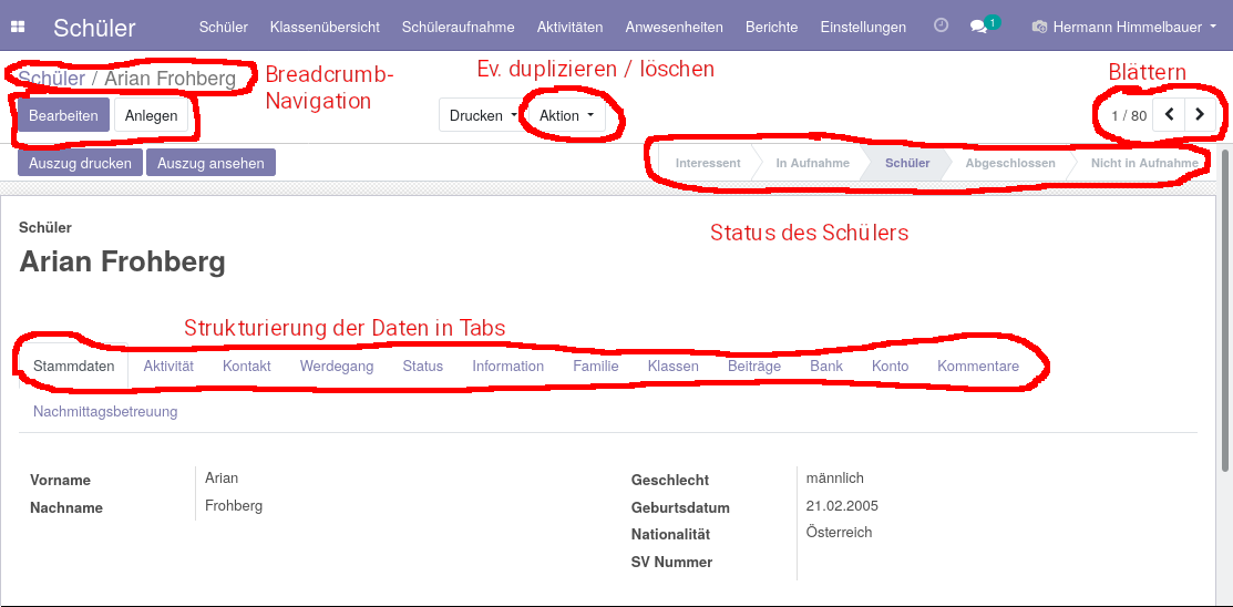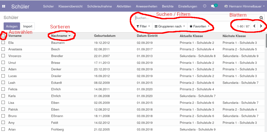 - Mit den Blättern-Tasten kann zu den nächsten Datensätzen (hier Schülern) navigiert werden